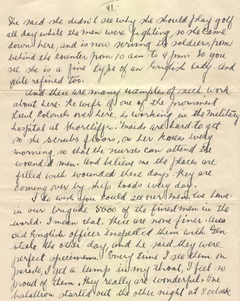 And there are many examples of such work about here. The wife of one of the prominent Lieut. Cols over here is working at the Military Hospital at Shorncliffe. Maids are hard to get, so she scrubs floors on her knees every morning, so that the nurses can attend the wounded men. And believe me the places are filled with wounded these days. They are coming over by shiploads every day.
