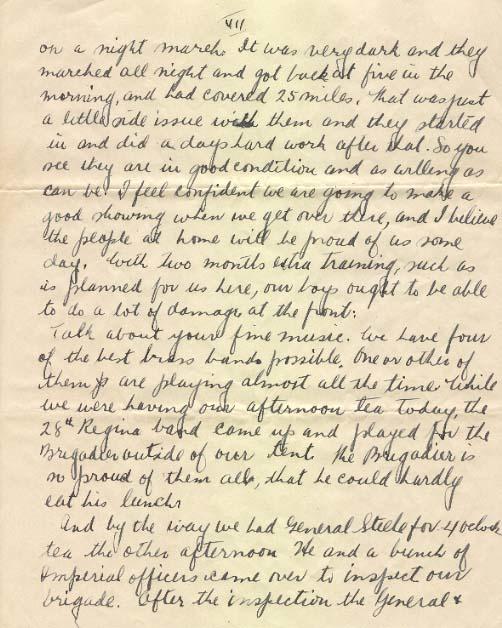 I do wish you could see our men. We have in our brigade 5000 of the finest men in the world. I mean that. There are none finer. An old English officer inspected them with Gen. Steele the other day and he said they were perfect specimens. Every time I see them on parade, I get a lump in my throat, I feel so proud of them. They really are wonderful. One battalion started out the other night at 8 o'clock on a night march. It was very dark and they marched all night and got back at 5 in the morning, and had covered 25 miles. That was just a little side issue with them, and they started in and did a day's hard work after that. So you see they are in good condition, and as willing as can be. I feel confident we are going to make a good showing when we get over there, and I believe the people at home will be proud of us some day. With two months extra training, such as is planned for us here, our own boys ought to be able to do a lot of damage at the front.