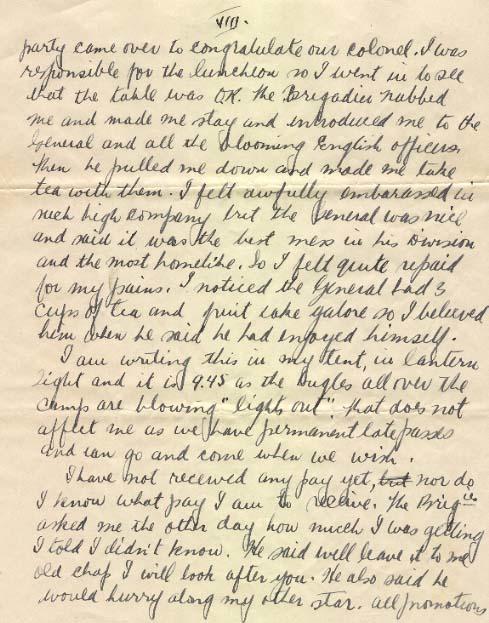 And by the way we had Gen. Steele for 4 o'clock tea the other afternoon. He and a bunch of Imperial officers came over to inspect our brigade. After the inspection the General and party came over to congratulate our colonel. I was responsible for the luncheon so I went in to see that the table was O.K. The Brigadier nabbed me and made me stay and introduced me to the General, and all the blooming English officers, then he pulled me down and made me take tea with them. I felt awfully embarrassed in such high company, but the General was nice and said it was the best mess in his Division and the most homelike. So I felt quite repaid for my pains. I noticed the General had three cups of tea, and fruitcake galore, so I believed him when he said he had enjoyed himself.