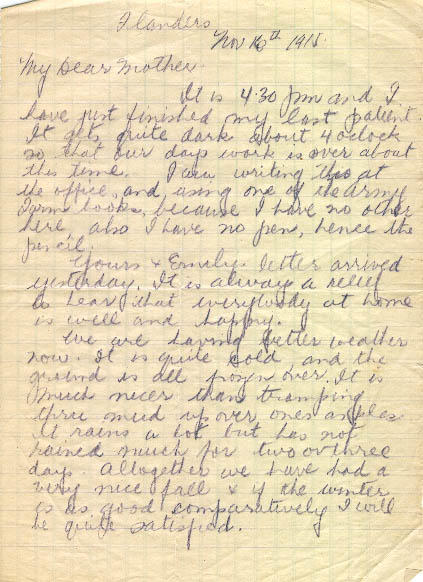 Yours and Emily's letters arrived yesterday. It is always a relief to hear that everybody at home is well and happy. We are having better weather now. It is quite cold, and the ground is all frozen over. It is much nicer than tramping through mud over one's ankles. It rains a lot, but has not rained much for two or three days. Although we have had a very nice fall, and if the weather is as good, comparatively, I will be quite satisfied. I was at a funeral this morning. One of my old friends, an officer of the Canadian Engineers, and a very fine chap. He did a lot of work for me when I was running or attempting to run the mess at Otterpool. You might remember the family. His father is J. L. Hughes who used to live across the street from Grandma in Toronto. I think he used to be Public School inspector. Quite a lot of the Big Ones were present. General Alderson, O. C. for Canadians, also General Turner O. C. of our Division. The service was very short & quite impressive. It was quite characteristic of our life out here, army life in general, I suppose. The band played the 'Dead March in Saul' on way to the grave. There they played 'Nearer My God to Thee' and sounded 'Last Post'. At that the service was ended, and the band about-turned and marched off playing their liveliest piece of ragtime. No use in feeling blue when there is so much to do. And I guess that is the proper way to look at it.