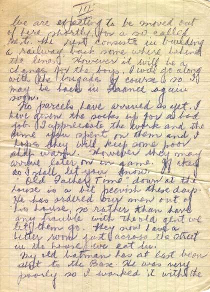 'Old Father Time' down at the house is a bit peevish these days. He has ordered our men out of his house, so rather than have any trouble with the old gent we let them go. They now have a better room just across the street in the house we eat in. My old batman has at last been sent to the Base. He was very poorly so I worked it with the M[edical] O[fficer] to have him returned to England. I have another one doing the job temporarily. In the meantime I have my eyes open for a good man.