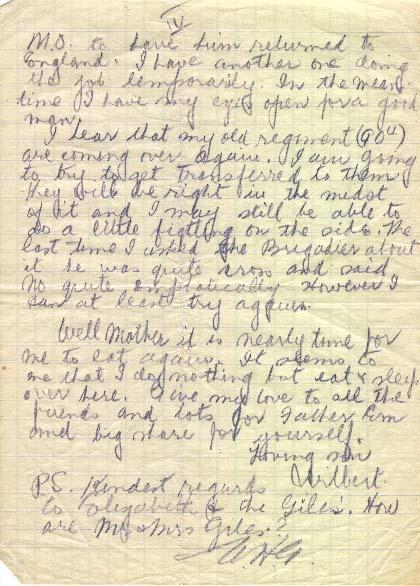Well Mother it is nearly time for me to eat again. It seems to me that I do nothing but eat and sleep over here. Give my love to all the friends and lots for Father, Em and big share for yourself.