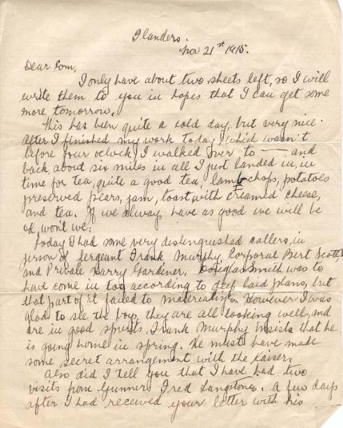 I only have about two sheets left, so I will write them to you in hopes that I can get some more tomorrow. This has been quite a cold day, but very nice. After I finished my work today, which wasn't before four o'clock, I walked over to [deleted] and back, about six miles in all. I just landed in time for tea, quite a good tea, lamb chops, potatoes, preserved pears, jam, toast with creamed cheese, and tea. If we always have as good we will be OK, won't we? Today I had some very distinguished callers, in person of Sgt Frank Murphy, Corporal Bert Scott, and private Harry Gardiner. Douglas Smith was to have come in too, according to deep?laid plans, but that part of it failed to materialize. However I was glad to see the boys, they are all looking well and are in good spirits. Frank Murphy insists that he is going home in spring. He must have made some secret arrangement with the Kaiser.