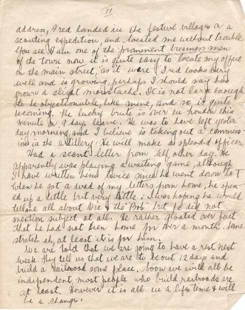 We are told that we are going to have a rest next week. They tell us that we are to be out 12 days and build a railroad some place. Soon we will all be independent, most people who build railroads are at least. However it is all in a lifetime and will be a change.