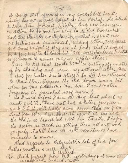 Is Marge still working on my socks? Tell her the winter has got a good start on her. Perhaps she intends to have them for next winter. And here is an open invitation for anyone wishing to do Red Cross work. Just tell them to write to me, as that is about our one pastime and amusement, reading letters. Tell Grace and Anne Wright, if they are at home, that it would be a fine way to do their bit. 'All correspondence treated as personal and names only on application'.