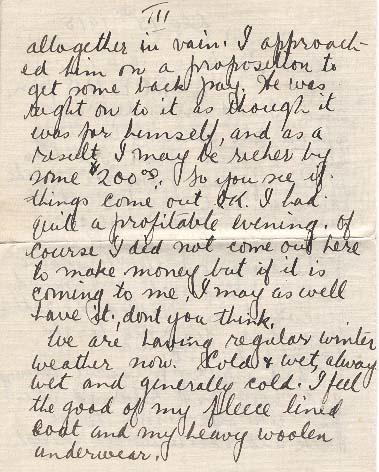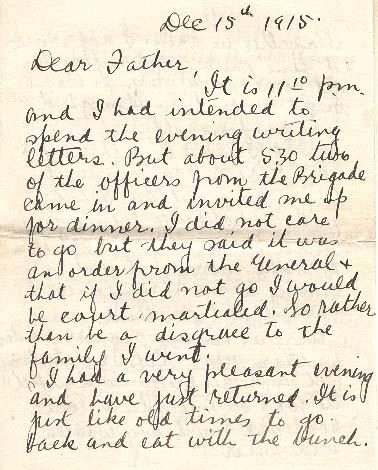 I had a very pleasant evening and have just returned. It is just like old times to go back and eat with the bunch. They are a fine bunch of fellows, and the Brigadier is the best of the bunch. After tea we had a nice quiet little smoke in the General's room, and he is just as nice as he ever was, and that is pretty nice. He hopes to get leave for Xmas, and is going to spend some time with his family. He is a regular family man, nothing pleases him so much as to get home with his wife and three little boys. They have a lovely big house over in Kent. I am so glad he is getting off for a little holiday, as he works so hard and looks a bit worried. And my evening was not altogether in vain, I approached him on a proposition to get some back pay. He was right on to it as though it was for himself, and as a result I may be richer by some $200.00. So you see if things come out 0.K., I had quite a profitable evening. Of course I did not come out here to make money but if it is coming to me, I may as well have it, don't you think?