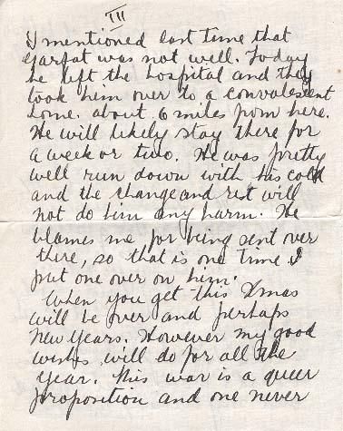 I mentioned last time that Garfat was not well. Today he left the hospital and they took him over to a convalescent home, about 6 miles from here. He will likely stay there for a week or two. He was pretty well run down with his cold, and the change and rest will not do him any harm. He blames me for being sent over there, so that is one time I put one over on him.