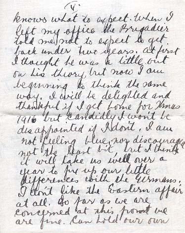 When you get this Xmas will be over and perhaps New Years. However my good wishes will do for all the year. This war is a queer proposition and one never knows what to expect. When I left my office the Brigadier told me not to expect to get back under two years. At first I thought he was a little out on his theory, but now I am beginning to think the same way. I will be delighted and thankful if I get home for Xmas 1916, but candidly, I won't be disappointed if I don't. I am not feeling blue, nor discouraged, not the least bit, but I think it will take us well over a year to fix up our little differences with the Germans. I don't like the Eastern affair at all. So far as we are concerned, at this front we are fine. Can hold our own and do a little better, but when you get those Balkan States into it, you never know when it is going to end.