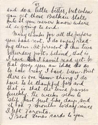 Many thanks for all the papers you have sent. I do enjoy reading them. At present I am two 'Saturday Posts' behind, that is I have two I haven't read yet. So that gives you an idea as to how busy I have been. But there is one thing I do have to be thankful for and that is that the time passes quickly. The weeks seem to slip past just like days, and it is 7 months today since I left Toronto.