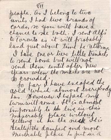 I sent Xmas cards to you people. As I belong to two units I had two brands of cards, so you will have a chance to see both. I sent Alf's to Toronto as it will probably land just about time he returns. I have one or two little trinkets to send home but will not send them till after New Years when the mails are not so crowded.