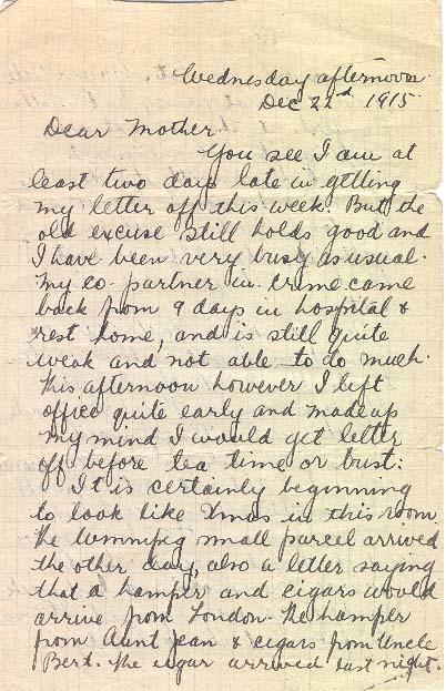 It is certainly beginning to look like Xmas in this room. The Winnipeg small parcel arrived the other day, also a letter saying that a hamper and cigars would arrive from London. The hamper from Aunt Jean & cigars from Uncle Bert. The cigar[s] arrived last night. Your parcels (Xmas) have not put in an appearance as yet. But they will come. Really I hardly know what to think. I feel rather embarrassed as it were. I did not know I had so many friends & such good ones. I have received parcels, puddings,& etc from some of my old patients in Winnipeg, by whom I thought I had been long since forgotten. And such nice letters. Our mantle is covered (littered is better word) with Xmas cards from Canada & England. And talk about your English hospitality, they are really too good. Cigars, cakes, handkerchiefs and even a lovely leather purse from one of my younger friends in England. One of Miss Ravenscroft's friends. This one is the Indian golf champion, although she is far from being an Indian. I think it will take me a long time to thank them all. I hope we don't have to move until we get some of the stuff eaten up. It would be rather awkward to have to carry it all.