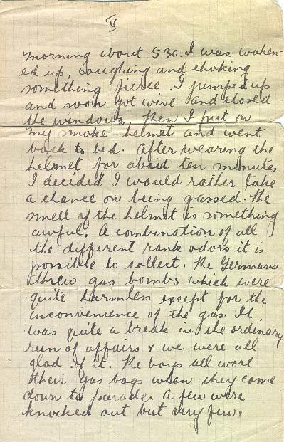 Now for a little local news which must necessarily be scarce. One morning last week (Sunday) we were gassed. It was the funniest thing. Early in the morning, about 5:30, I was wakened up, coughing and choking something fierce. I jumped up and soon got wise and closed the windows. Then I put on my smoke-helmet and went back to bed. After wearing the helmet for about ten minutes I decided I would rather take a chance on being gassed. The smell of the helmet is something awful. A combination of all the different rank odors it is possible to collect. The Germans threw gas bombs which were quite harmless except for the inconvenience of the gas. It was quite a break in the ordinary run of affairs & we were all glad of it. The boys all wore their gas bags when they came down to parade. A few were knocked out but very few.