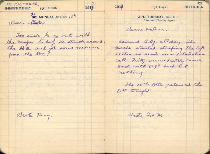 Around B.Hg. all day. The Bosche started strafing the left sector so sent in a retaliation call. Fritz immediately came back with 5.9's but hit nothing