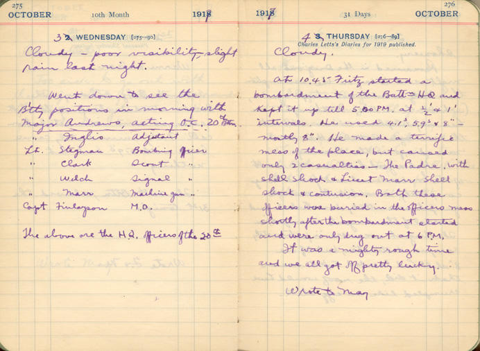 At 10.45 Fritz started a bombardment of the Batn H.Q. and kept it up till 5.00 PM at ½' and 1' intervals. He used 4.1s, 5.9s and 8" - mostly 8". He made a terrific mess of the place, but caused only 2 casualties - The Padre, with shell shock and Lieut. Marr shell shock and contusion. Both these officers were buried in the officers mess shortly after the bombardment started and were only dug out at 6 PM.