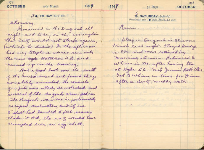 Sleep in Dugout in Bluemore trench last night. Played bridge in A.M. and was relieved by Manning at noon. Returned to W. Lines in PM, after having tea at Bgde H.Q. Met Jimmie Bell there. Got to W. Lines in time for Dinner after a dirty, muddy walk.