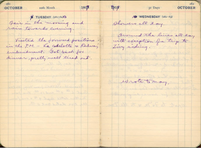 Visited the forward positions in the P.M. - La Cahelotte and Railway embankment. Got back for dinner, pretty well tired out.