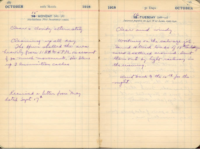 Working on the salvage job. Found 4 trench loads of 18 " Cartridge cases scattered around. Sent them out by light railway in the evening.