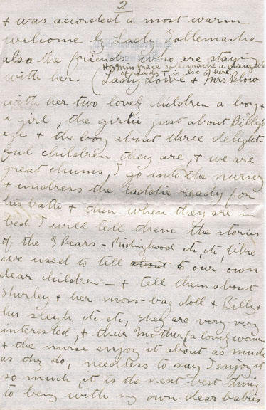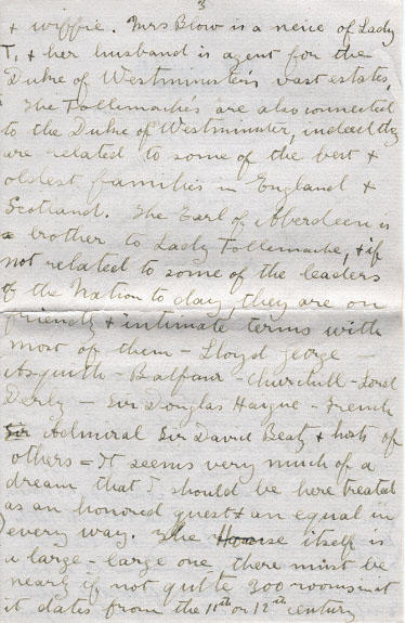 The Hall stands in the center of a large Park thickly wooded with giant oak and elm chiefly, and a large herd of Red-Deer and Black Deer (wild) live in and there must be hundreds of them, there are several small lakes in the Park well stocked with fish. Needless to say, there are rich collections of priceless paintings etc - etc, and the great library with its rare old books needless to say is a delight to me and I spend a good deal of my time in it. There is a wonderful old church on the estate, and I had the great and unique privilege of preaching the sermon at this evenings service. Something unusual preaching in an Anglican Church, in Old England, I esteem it as a high honour. Now dear Betty I must close for now, with just a word again about the extreme kindness of these gentle and noble, truly aristocratic people. Lady Lowe belongs to a family no less distinguished than Lady Tollemache her grandfather was a governor of New-Brunswick in the early days, and her husband has held similar positions in various parts of the Empire, she herself is a most brilliant woman quite a literary genius, and is on intimate terms with all the literary leaders worth knowing both in England and elsewhere - she is a beautiful character and sweet disposition, and one of these days soon you may receive a letter from her for she asked me of she might write to you - she wants to tell you, she said what they think of me. I shall never - never forget all her kindness and the kindness of her friends as long as I live - many of our snobbish wealthy people in Canada would give a million to two, if they could have the entre into such a circle - and the people I have met over here, are just the kind who will be life long friends.