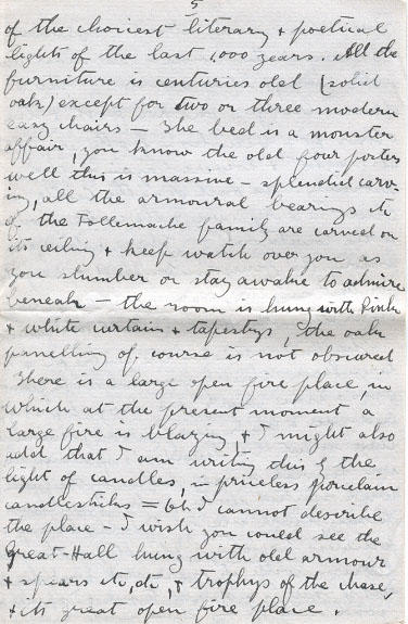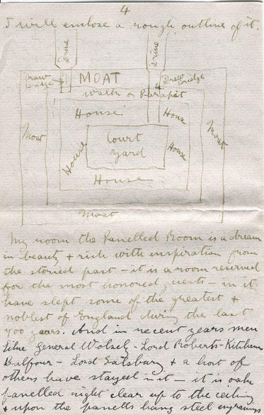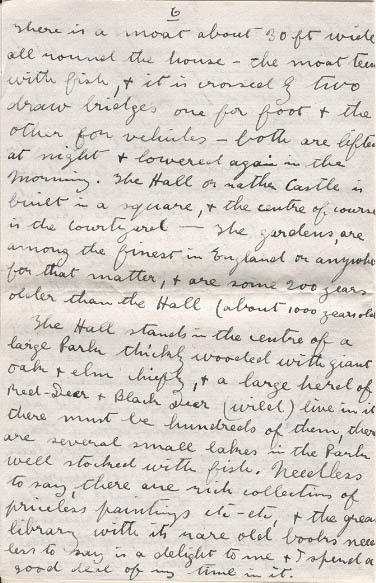 My room the Panelled Room is a dream in beauty and rich with inspiration from the storied past - it is a room reserved for the most honored guests - in it have slept some of the greatest and noblest of England during the last 700 years. And in recent years men like General Wolsely - Lord Roberts - Kitchener - Blafour - Lord Salsbury and a host of others have stayed in it - it is oak paneled right clear up to the ceiling and upon the panels hang steel engravings of the choicest literary and poetical lights of the last 1,000 years. All the furniture is centuries old (solid oak) except for the two of three modern easy chairs - The bed is a monster affair, you know the old four posters well this is massive - splendid carving, all the armoural bearings etc of the Tollemache family are carved on its ceiling and keep watch over you as you slumber or stay awake to admire beneath - the room is hung with Pinkand white curtain and tapestrys, the oak paneling of course is not obscured. There is a large open fire place, in which at the present moment a large fire is blazing, and I might also add that I am writing this by the light of candles, in priceless porcelain candlesticks = Oh I cannot describe the place - I wish you could see the Great-Hall hung with old armour and spears etc, etc, and trophys of the chase, and its great open fire place. There is a moat about 30 ft wide all round the house - the moat teems with fish, and it is crossed by two draw bridges one for foot and the other for vehicles - both are lifted at night and lowered again in the Morning. The Hall or rather Castle is built in a square, and the center of course is the courtyard - The gardens, are among the finest is England or anywhere for that matter, and are some 200 years older than the Hall (about 1000 years or so)