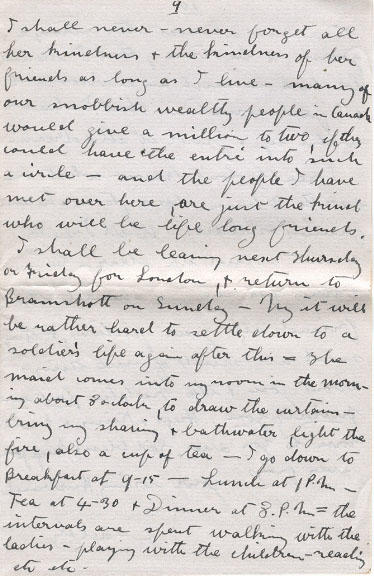 I shall be leaving next Thursday or Friday for London, and return to Bramshott on Sunday - My it will be rather hard to settle down to a soldier's life again after this = The maid comes into my room in the morning about 8 o'clock, to draw the curtains - bring my shaving and bathwater, light the fire, also a cup of tea - I go down to Breakfast at 9-15 - Lunch at 1 P.M. - Tea at 4-30 and Dinner at 8 P.M. = the intervals are spent walking with the ladies - playing with the children - reading etc-etc. It seems almost too strange good to be true, that I should be here in such an environment and I feel sometimes that I shall wake up and find it all a dream.