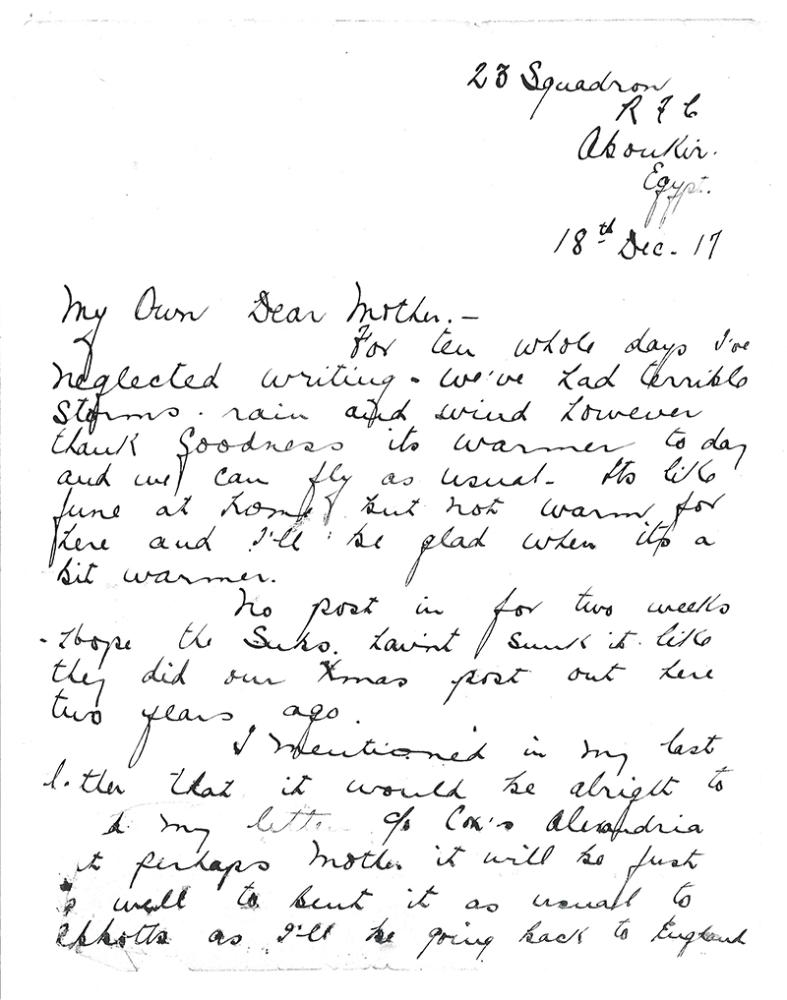 I mentioned in my last letter that it would be alright to send my letters c/o Cox's Alexandria but perhaps Mother it will be just as well to send it as usual to Abbots as I'll be going back to England in the spring.