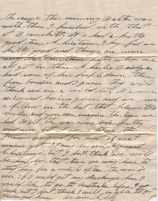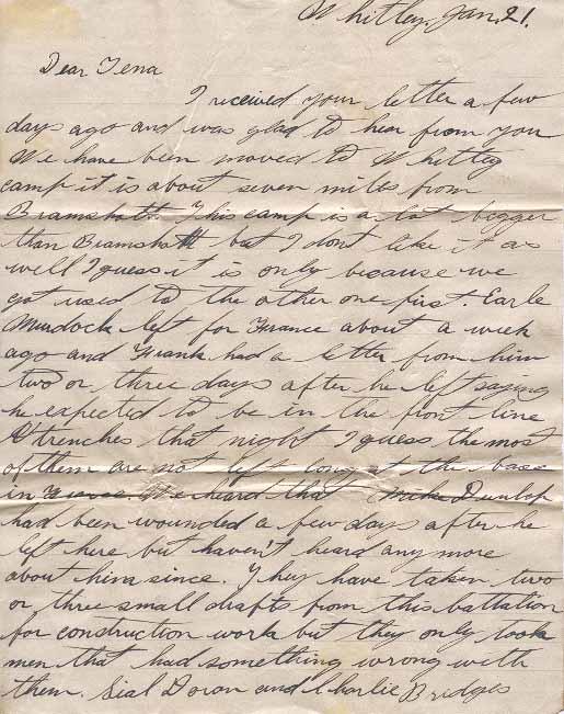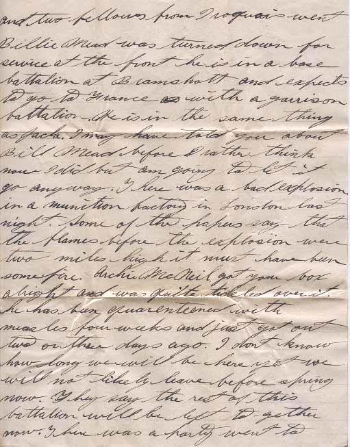 I received your letter a few days ago and was glad to hear from you. We have been moved to Whitley camp it is about seven miles from Bramshott. This camp is a lot bigger than Bramshott but I don't like it as well I guess it is only because we got used to the other one first. Earle Murdock left for France about a week ago and Frank had a letter from him two or three days after he left saying he expected to be in the front line trenches that night I guess the most of them are not left long at the base in France. We heard that Mike Dunlop had been wounded a few days after he left here but haven't heard any more about him since. They have taken two or three small drafts from this battalion for construction work but they only took men that had something wrong with them. Sial Doran and Charlie Bridges and two fellows from Iroquois went Billie Mead was turned down for service at the front he is in a base battalion at Bramshott and expects to go to France with a garrison battalion. He is in the same thing as Jack. I may have told you about Bill Mead before I rather think now I did but I am going to let it go anyway. There was a bad explosion in a munition factory in London last night. Some of the papers say that the flames before the explosion were two miles high it must have been some fire. Archie McNeil got your box alright and was quite tickled over it he has been quarenteened with measles four weeks and just got out two or three days ago. I don't know how long we willl be here yet we will not likely leave before spring now. They say the rest of this battalion will be left to-gether now. There was a party went to the ranges this morning. Walter was with them. I finished with that at Bramshott. We had a pretty good time Christmas. They fed us pretty good and things are never very dull in those huts when we all get in there. Charlie Bridges had some of his people down there from London and I guess they will think we are a wild lot. We were issued boxing gloves and we have a fellow in the hut that plays the violin and you can imagine the time we had. Well the war news looks pretty good now but it seems to me the Germans are good for most of next summer yet. It may be over by next Christmas but I don't think we will be home by that time we may have to stay here for a while after the war is over. If I could get my discharge here I would like to go to Australia before I go back but I don't think I will be able to get discharged here. As ever Cliff.