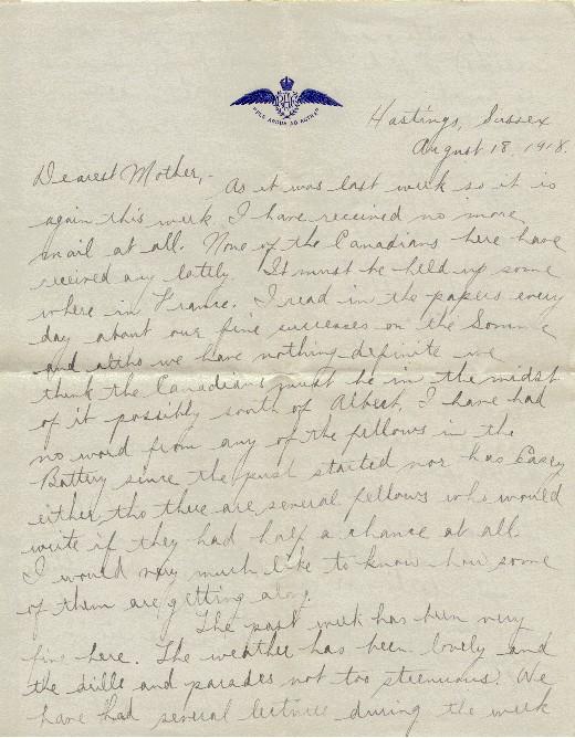 As it was last week, so it is again this week, I have received no more mail at all. None of the Canadians here have received any lately. It must be held up somewhere in France. I read in the papers every day about our fine successes on the Somme and, altho we have nothing definite, we think the Canadians must be in the midst of it, possibly south of Albert. I have had no word from any of the fellows in the Battery since the push started, nor has Casey either, tho there are several fellows who would write if they had half a chance at all. I would very much like to know how some of them are getting along.