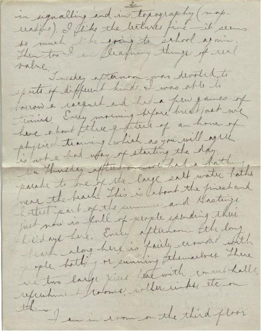 The past week has been very fine here. The weather has been lovely and the drills and parades not too strenuous. We have had several lectures during the week in signalling and in topography (map reading). I like the lectures fine - it seems so much like going to school again. Then too, I am learning things of real value.