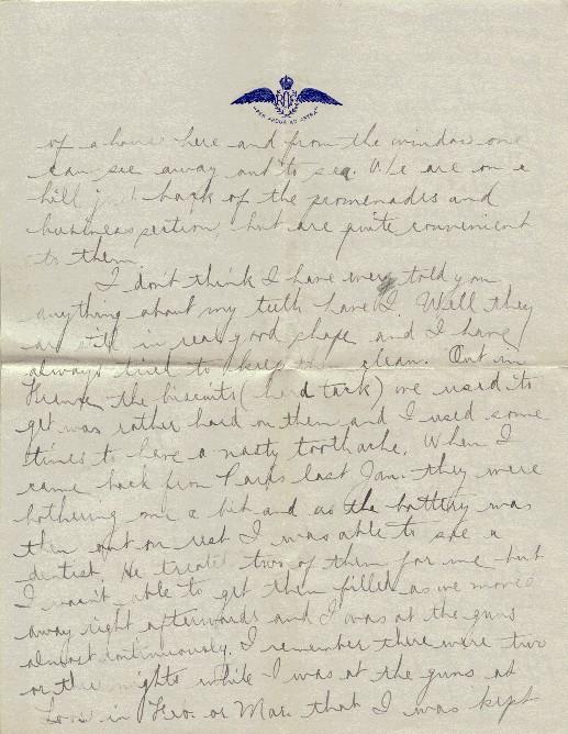 One of the first things they did when we got to Hastings here was to examine everyone's teeth. With mine, he said there should be four fillings, two on each side of the lower jaw, but that's as much as they did. About a couple of weeks ago, one of my teeth began aching again for about three days and this time my jaw swelled up quite a bit. It got a bit better after that but the swelling still remained. I went on sick parade with it a week ago Sat. and managed to see the dentist last Monday. These dentists are good and do the work for all the RAF forces here, so I am lucky in getting fixed up by them. As I feared, I had to have this tooth pulled, the first of my permanent teeth I have had to lose. It was loose and he put some anaesthetic on it so it didn't hurt so very much. He showed me where the root had swollen and an abcess was forming. I had him look at the rest of my teeth and he gave me an appointment for next Wed. So I hope I shall be able to get them fixed up properly - good work done for nothing. The tooth he pulled was third from back on right side of lower jaw. Lots of love to all.