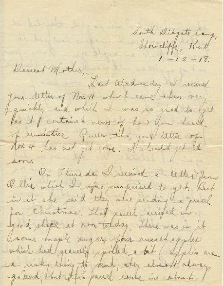 Last Wednesday, I received your letter of Nov. 11 which came thru very quickly and which I was so glad to get as it contained news of how you heard of armistice. Queer tho, your letter of Nov. 4 has not yet come. I should get it soon.