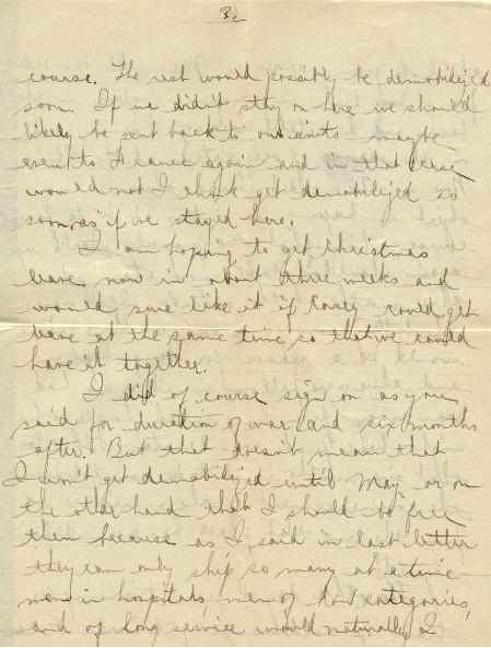 I am hoping to get Christmas leave now in about three weeks and would sure like it if Casey could get leave at the same time so that we could have it together. I did, of course, sign on, as you said, for duration of war and six months after. But that doesn't mean that I won't get demobilized until May or, on the other hand, that I should be free then because, as I said in last letter, they can only ship so many at a time - men in hospitals, men of low categories and of long service would naturally, I think, be given preference. Men will be needed for a long time in camps in England, in the bases and devastated areas of France, and in the army of occupation at the Rhine. Now in this cadet course, there is no object in keeping us unless it be to finish course which, if it were properly started up again, shouldn't take more than about three months at the outside. If I were in the battery now, you can see how there would be a reason for being kept in and there were fellows in it who had been away from home much longer who might have first consideration. Then, too, that six months - is it to be counted from the commencement of the armistice or from the time that peace has been definitely signed?