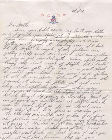 Since you didn't answer my last letter so I figured you didn't get it. We have been flying here everyday since Friday and I am getting pretty good at bombing even if I don't hit the target. A couple of the fellows are getting pretty sick and I think that one of them is going to get washed out. I have felt pretty lousy the last couple of flights but I haven't got sick as yet. It is sure a great thrill to watch your bombs drop away and follow it all the way down. When it gets near the ground it seems to flatten out and race along level with the ground while you sit up in the bomb hatch trying to make it hit the target by praying or something. Most of us figured we would hit the little shack near the target but so far we haven't even come close to it. We fired a machine gun the other day and I took some pictures of a few of the fellows and I will send you a copy if they turn out any good. We had to fill our own ammunition belts outside and our hands sure got cold. I sure wouldn't want to be in front of one of those guns when it cut loose because they can sure throw the lead plenty fast. We had a minor accident here last night a Bolingbrooke had to land with its wheels up it didn't hurt it much but it sure scared the pants of the air gunner in the turret. I bet he had to change his undies last night.