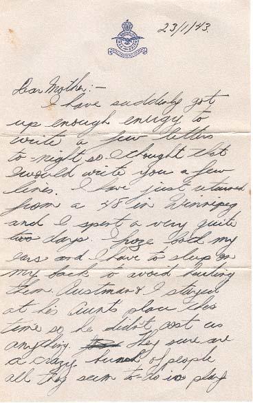 I have suddenly got up enough energy to write a few letters to-night so I thought that I would write you a few lines. I have just returned from a 48 in Winnipeg and I spent a very quite two days. I froze both my ears and I have to sleep on my back to avoid hurting them. Austman and I stayed at his Aunt's place this time so he didn't cost us anything. They sure are a crazy bunch of people all they seem to do is play bridge and gad around but they are sure a lot of fun. We went to the "Cave" in Winnipeg on our remaining $2.40 and had a fairly good time but it wasn't at all like I thought it would be. We only had $10.00 each to start with so we couldn't do anything very expensive. I am invited there again when I start my leave but I am coming home where it isn't so cold and windy.