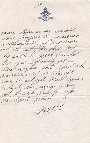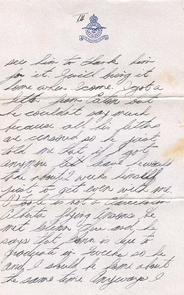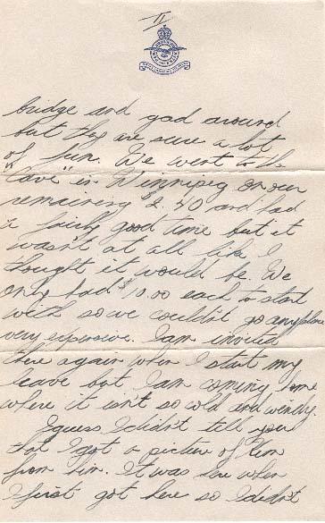 I guess I didn't tell you that I got a picture of Kim from him. It was here when I first got here so I didn't see him to thank him for it. I will bring it home when I come. I got a letter from Eaton but he couldn't say much because all his letters are censored so he just told me that if I got anymore leave he would take about 2 weeks himself just to get even with me. O'Toole is not a Clarceholm Alberta flying Ansons. He met Glenn there and he says that Glenn is due to graduate in 2 weeks so he and I should be home about the same time. Anyways I sure hope so as I won't have anyone to go around with outside of Boomhower and the rest of the boys and they will be going to school. Oh yes I finally got a new uniform but I feel like a rookie in it so I haven't worn it yet. Well I guess I should close now as I have got to write Melville before the lights go out.