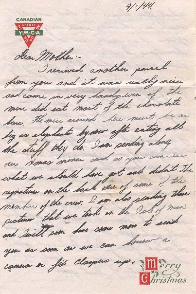 I received another parcel from you and it was really nice and came in very handy even if the mice did eat most of the chocolate bars. The mice around here must be as big as elephants by now after eating all the stuff they do. I am sending along our Xmas menu card so you can see what we should have got and didn't. The signature on the back are of some of the members of the crew. I am also sending those pictures that we took on the Isle of Man and I will soon have some more to send you as soon as we can borrow a camera or fix Claspers up.