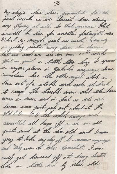 My skipper has been grounded for the past week so we haven't been doing any flying at all. So that means that we will be here for another fortnight more. Which is maybe just as well. Everybody is getting posted away from this dump but us and we are on our 12th week. That is just a little too long to spend in anyone place in Yorkshire anyways. Some Canadians here the other night stole a horse out of a stable and rode it back to camp. The trouble was that the horse was a mare and in foal so the old farmer was quite put out about it. The old C.O.C.B the whole camp and cancelled all days off so we are quite mad at the dear old soul. I am going to take my day off to-morrow anyways and they can do their damndest. I am really get browned off at being treated like a little kid by these old school tie drips. To bad we all wasn't in the army with half these officers so we could fix them proper. Sometimes I think that the guys in the army are a lot better off they do at least get the chance to get rid of any officer they don't like. I can't understand the attitude of some of these guys you would think that they were a bunch of old grandmothers instead of a qualified leader. After nearly five years of war some people over here don't even know there is a war on and I don't think that they will ever smarten up either.