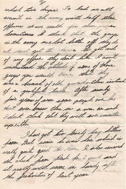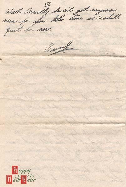 I have got two lovely long letters from Mel since he was here which is really quite good for him. I also received the check from Dad for 2 quid and it really will come in handy after the festivities of last year. Well I really haven't got anymore news for you this time so I shall quit for now.