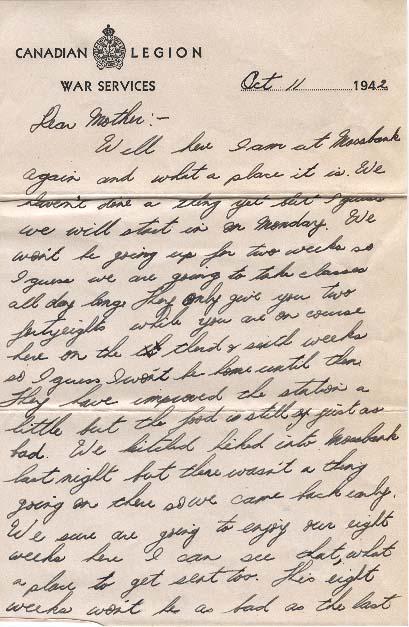 Well here I am at Mossbank again and what a place it is. We haven't done a thing yet but I guess we will start in on Monday. We won't be going up for two weeks so I guess we are going to take classes all day long. They only give you two forty eights while you are on course here on the third and sixth weeks so I guess I won't be home until then. They have improved the station a little but the food is still just as bad. We hitch hiked into Mossbank last night but there wasn't a thing going on there so we came back early. We sure are going to enjoy our eight weeks here I can see that I what a place to get sent to. This eight weeks won't be as bad as the last time though because we will be doing something this time and I hope the time passes pretty quick. Most of the fellows that we used to know are still here and we sure got kidded about coming back here. I guess you had better send my belt when you have the chance. I don't suppose you have heard from Melville yet so you won't know his address. When you get it send it to me so that I can write him. I haven't got much to write about as yet except to ask you not to forget to send the funnies and the liberty and that parcel Aunt Grace is talking about. My address is the same except I am in 11A