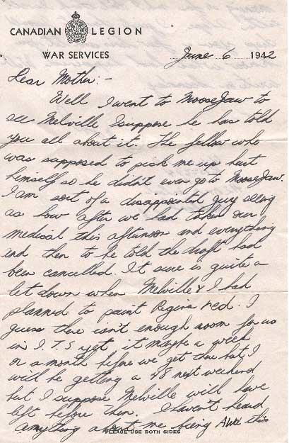 Well I went to Moose Jaw to see Melville I suppose he has told you all about it. The fellow who was supposed to pick me up hurt himself so he didn't even go to Moose Jaw. I am sort of a disappointed guy seeing as how after we had taken our medical this afternoon and everything and then to be told the draft had been canceled. It sure is quite a let down when Melville and I had planned to paint Regina red. I guess there isn't enough room for us in I.T.S yet I it maybe a week or a month before we get there but I will be getting a 48 next weekend but I suppose Melville will have left before then. I haven't heard anything about me being AWOL this morning so far and I don't think I will either I hope. I just thought I would drop you a few lines and let you know what had happened. Will write on Sunday.
