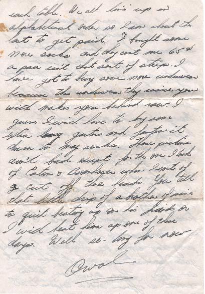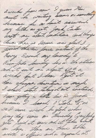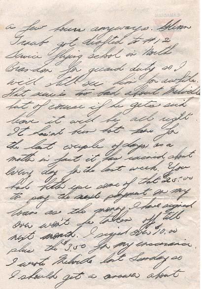 Well here goes another week. Boy the days sure fly by. I have been here three weeks today and it hardly seems like it at all. We were moved from "A" Squadron up to "B" Squadron on Tuesday and it sure is different up here. The beds are a lot closer together and there are twice as many men too. We are now waiting to be drafted out of here but I don't suppose it will be for another month as we still have about 10 days training to do. Our new sergeant told us we could have a 48 about the 15 of May so I guess I will be home for a few hours anyways. Glenn Traub got drafted to #12 service flying school in North Brandon for guard duty so I will still see him for awhile. That sure is too bad about Melville but of course if he gets sick leave it will be all right. It hasn't been hot here for the last couple of days as a matter of fact it rained about every day for the last week. You had better use some of that $25.00 to pay the next payment on my loan as the money I have signed over won't be taken off till next month. I signed over $10.00 plus the $3.50 for my insurance. I wrote Melville last Sunday so I should get a answer about 2 weeks from now. I guess Ken must be writing exams or something because he hasn't answered my letter as yet. Jack Eaton wrote me about conditions and things down there so I sure am glad I joined the air force instead of the Navy. I send my laundry to Aronford's Laundry here in the station and it costs me about 60 cents a week but I'm sure I can get it done cheaper downtown so maybe I shall start taking it out instead. I am getting a little low in funds because r loaned 0' Toole $5.00 so I sure will be glad when pay day comes on Thursday. Everybody gets paid at once and it takes about an hour. There are three tables with a officer and a corporal at each table. We all line up in alphabetical order so I am about the last to get paid. I bought some more socks and they cost me 65 cents a pair isn't that sort of steep. I have got to buy some more underwear because this underwear they issue you with makes your behind raw. I guess I will have to by some extra garters and fasten it down to make socks. Those pictures aren't bad except for the one I took of Eaton and Boomhower when I sort of cut off their heads. You tell that little drip of a brother of mine to quit beating up on his friends or I will beat him up one of these days. Well so-long for now.