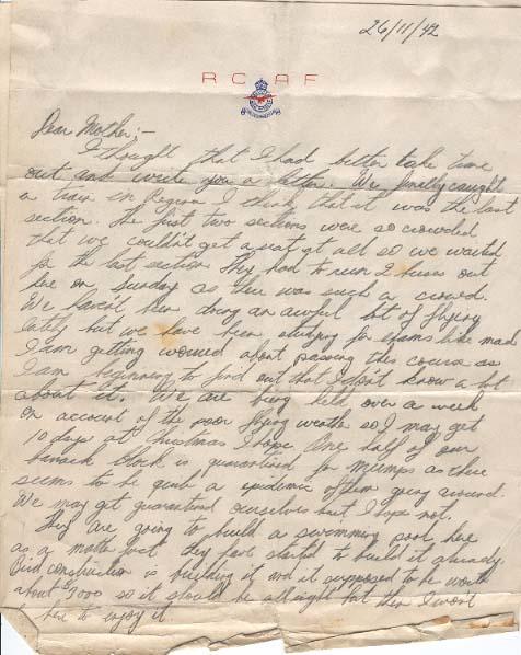 I thought that I had better take time out and write you a letter. We finally caught a train in Regina I think that it was the last section. The first two sections were so crowded that we couldn't get a seat at all so we waited for the last section. They had to run 2 buses out here on Sunday as there was such a crowd. We haven't been doing an awful lot of flying lately but we have been studying for exams like mad. I am getting worried about passing this course as I am beginning to find out that I don't know a lot about it. We are being held over a week on account of the poor flying weather so r may get 10 days at Christmas I hope. One half of our barrack block isquarantined for mumps as there; sums to be quite an epidemic of them going around. We may get quarantined ourselves but I hope not.