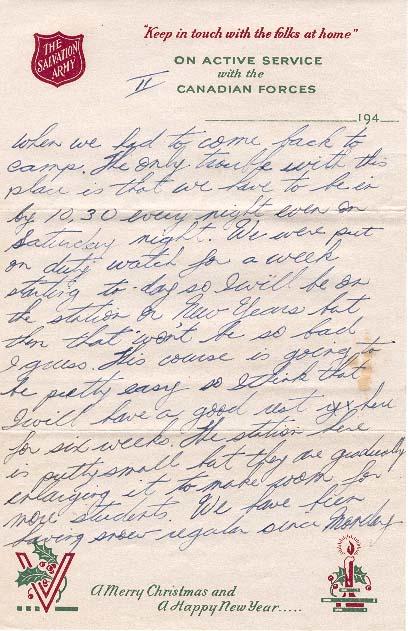 Here I am at Portage and it sure is a change from Mossbank. There are about 4 canteens here and a civilian mess hall where you can eat after 10 o'clock. Our mess hall is ran by the C.P.R and all we do is go in and sit down at a table and they bring grub to us. The food is sure swell and I think that I will put on weight here. We have been into Portage three times and it is quite a nice little joint even if there isn't much to do. We went to a dance there last night and we had quite a good time until 12 0' clock when we had to come back to camp. The only trouble with this place is that we have to be in by 10:30 every night even on Saturday night. We were put on duty watch for a week starting to-day so I will be on the station on New Years but then that won't be so bad I guess. This course is going to be pretty easy so I think that I will have a good rest here for six weeks. The station here is pretty small but they are gradually enlarging it to make room for more