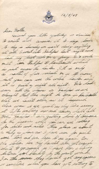 Received your letter yesterday so decided to write and answer it to-day. Since to-day is Sunday we aren't doing anything at all. I went into Halifax last night and had my first ride on a ferry. We rode on it from Halifax to Dartmouth which is just across the harbor. It is only a matter of five minutes or so to cross but you can see the whole harbor and it is quite a sight all right. We had seen all the shows in Halifax so we thought that there might be one in Dartmouth that we hadn't seen, as it happened there was so we spent a dry time seeing it. After walking up and down hill all over Halifax I am getting kind of lonesome for the prairies where you can see nothing for miles and miles. This place is about a dirty a place as I have seen for quite some time and ever hope to see again. On the station here they haven't even got enough sheets to go around so I have been sleeping between wool blankets for the past week. In the mess they haven't got any spoons so sometimes when you have got nothing to do just try eating soup without a spoon. I have got all my webbing equipment now and it sure weighs you down. I tried putting my suitcase inside my kit bag to-day and after alot of grunting and groaning I finally managed it, so unless they issue us with much more stuff I think that I will take it that way. I thought maybe I had left my pen down at the garage but anyways I bought another one exactly the same so I guess it is all right. I haven't located Jack yet so I guess he is out on board ship but I will try again this afternoon. I bought five more hankies at the canteen here and I will buy some more before I leave so I will be well supplied up. I got a letter from Melville Friday and I will send it along. It seems to me that you have been telling him things about me tsk! tsk. Well anyways by one of my letters I must have let a little girl down boy did I catch hell. I suppose I will have to write her a nice mushy letter and smooth things over a little. So Dad finally sold the old jeep, what happened to Leonard the super salesman. You will have to do better than that Leonard or I will disown you as my brother.