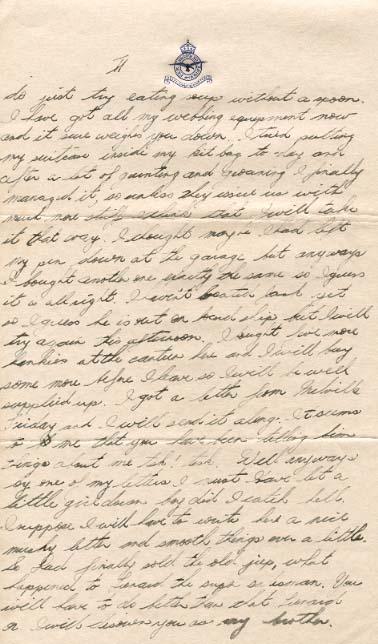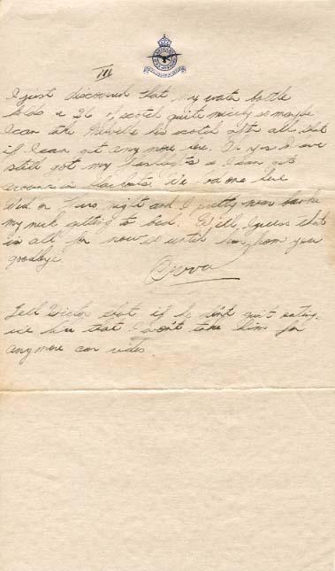 I just discovered that my water bottle holds 26 of scotch quite nicely so maybe I can take Melville his scotch after all that if I can get any more here. Oh yes I have still got my flashlights so I can get around in blackouts. We had one here Wed. or Thurs. night and I pretty near broke my neck getting to bed. Well I guess that is all for now so until hear from you goodbye.
