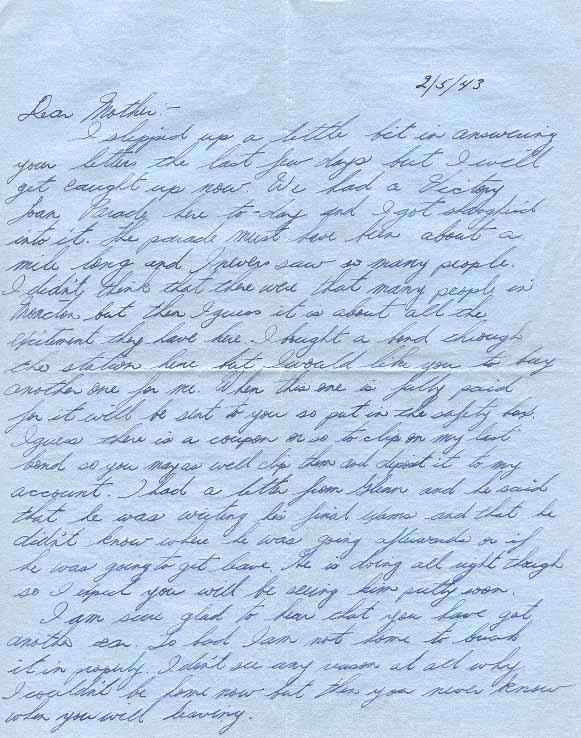 I slipped up a little bit in answering your letters the last few days but I will get caught up now. We had a Victory Loan Parade here to-day and I got shanghied into it. The parade must have been about a mile long and I never saw so many people. I didn't think that there were that many people in Moncton but then I guess it is about all the excitement they have here. I bought a bond through the station here but I would like you to buy another one for me. When this one is fully paid for it will be sent to you so put in the safety box. I guess there is a coupon or so to clip on my last bond so you may as well clip them and deposit it to my account. I had a letter from Glenn and he said that he was writing his final exams and that he didn't know where he was going afterwards or if he was going to get leave. He is doing all right though so I expect you will be seeing him pretty soon.