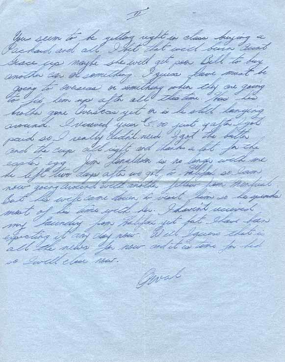 I am sure glad to hear that you have got another car. To bad I am not home to break it in properly. I don't see any reason at all why I couldn't be home now but then you never know when you will be leaving. You seem to be getting right in class buying a Packard and all. I bet that will burn Aunt Grace up maybe she wi11 get poor Bill to buy another car or something. I guess Dave must be going to overseas or something when they are going to fix him up after ail this time. Has his brother gone Overseas yet or is hestill hanging around. I received your $5.00 just after I got paid so I really didn't need. I got the butter and the cup all right and thanks a lot for the easter egg. Jim Donaldson is no longer with me he left two days after we got to Halifax so I am now going around with another fellow from Montreal. "-- But his wife came down to visit him so he spends most of his time with her. I haven't received my laundry from Halifax yet but I have been expecting it any day now. Well I guess that is all the news for now and it is time for bed so I will close for now.