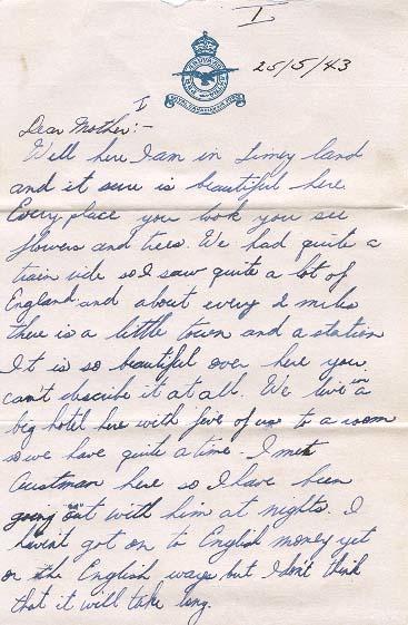 Well here I am in Limey land and it sure is beautiful here. Every place you look you see flowers and trees. We had quite a train ride so I saw quite a lot of England and about every 2 miles there is a little town and a station. It is so beautiful over here you can't describe it at all. We live in a big hotel here with five of us to a room so we have quite a time. I met Austman here so I have been going out with him at nights. I haven't got on to English money yet or the English ways but I don' think that will take long.