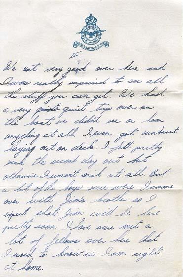 We eat very good over here and I was really surprised to see all the stuff you can get. We had a very quiet trip over on the boat we didn't see or hear anything at all. I even got sunburnt laying out on deck. I felt pretty sick the second day out but otherwise I wasn't sick at all. But a lot of the boys sure were. I came over with Jim's brother so I expect that Jim will be here pretty soon. I have sure met a lot of fellows over here that I used to know so I am right at home.