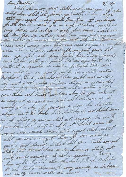 Well here is my first letter of the new year to you and I hope that it finds you well. I sure hope that you spend a very good New Year to make up for the one I spent here in camp. well not exactly in camp but in the village 5 miles from camp. I did see the New Year in but we didn't even sing Auld Lang Syne. This makes the second New Year and the 1st Xmas I have spent away from Home and each one makes me feel worse. This girl there looked after me quite good but since you don't like having English girls in the family maybe I had better get posted. We are expecting to be posted to a squadron in about a fortnights time so I guess that we are finally going to see a little action. My friend Kiwi has already been posted and so have the rest of the gang so I am the only one of the old bunch left here. We have had a picture of the crew taken and I will send one along for you when it is ready and you can see just what the score is. We usually get a day off every week from here but the skipper went to London on his last day off and didn't