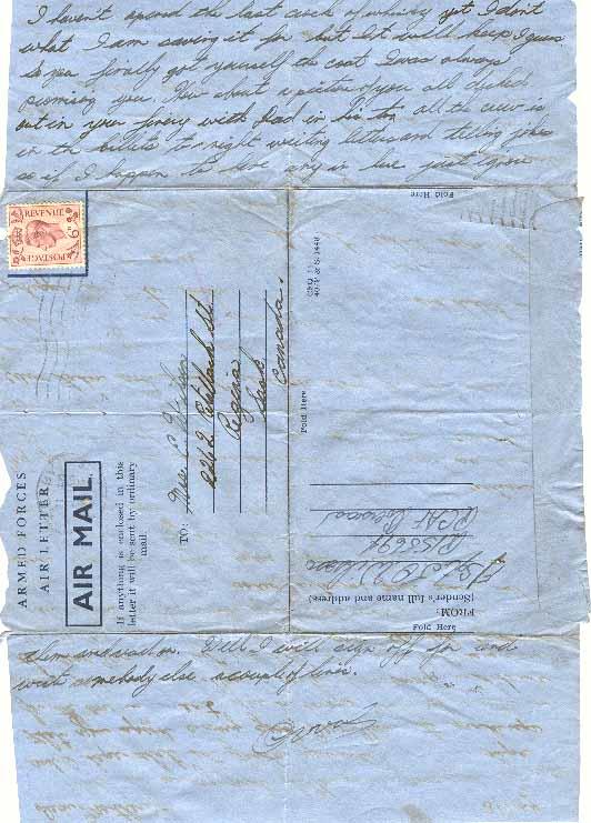 I haven't opened the last crock of whiskey yet I don't what I am saving it for but it will keep I guess. So you finally got yourself the coat I was always promising you. How about a picture of you all decked out in your finery with Dad in his too. All the crew is in the billets to-night writing letters and telling jokes so if I happen to have any in here just ignore them and read on. Well I guess I will sign off for and write somebody else a couple of lines.